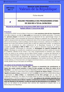 Voici le résumé du préambule des programmes d’EMC de 2024 parus au BO n°25 du 24/06/2024. C’est un document qui fait partie de la liste officielle fournie afin de préparer cette épreuve d’entretien.
